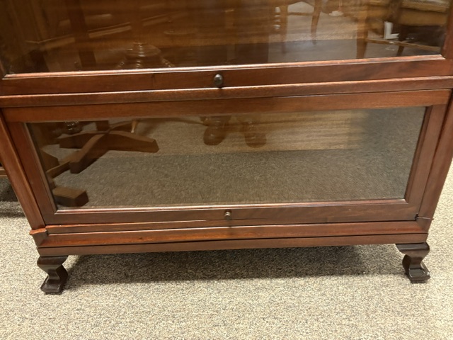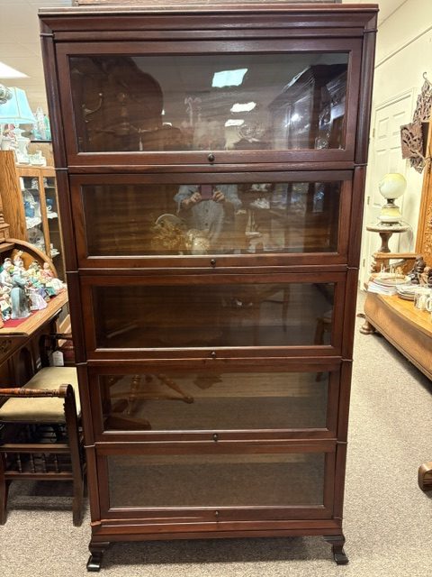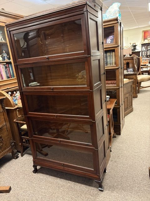Beautiful  Mahogany Stacking Bookcase,   5 Stack,   no labels,  attributed to Macey.   Beautiful woodgrain,   paneled sides,  stylized feet.   A rare style in wonderful restored condition.     circa  1900-1910